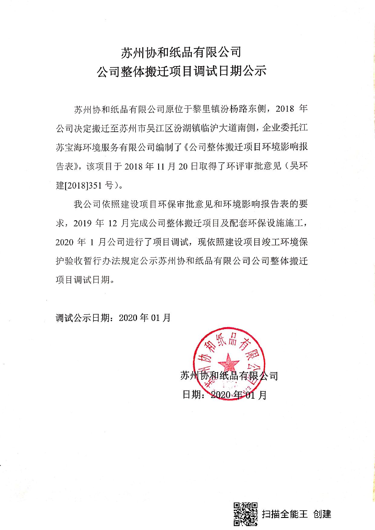 苏州协和纸品有限公司整体搬迁项目调试日期公示2